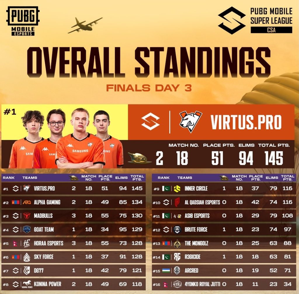 “Sky Force” баг 17 дахь тоглолт хүртэл гуравдугаар байрт явж байсан ч сүүлийн тоглолтын үр дүнд оноо дутсан тул энэ жилийн дэлхийн аваргыг өнжихөөр болов. Харин “Alpha Gaming” баг Монгол Улсыг төлөөлөн дэлхийн аварга шалгаруулах тэмцээнд ганцаараа оролцох эрхээ авлаа.