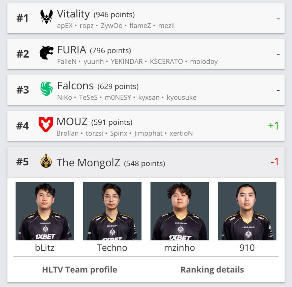CS2 төрлийн дэлхийн чансааны шинэ оноо зарлагдаж, Монголын The MongolZ баг нэг байр ухран 5-р байрт бичигджээ. Өмнөх долоо хоногт дөрөвдүгээрт байсан тус багийн хувьд энэ бол багахан бууралт ч дэлхийн топ тавд багтсан амжилтаа хадгалж байгаа нь бахархууштай үзүүлэлт юм.