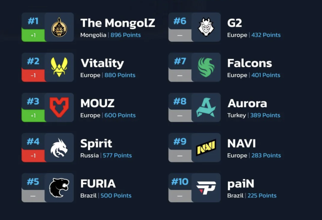 HLTV-ийн сүүлийн үеийн чансаанд The MongolZ баг 896 оноотойгоор тэргүүлж, Францын Vitality баг 880 оноотойгоор хоёрдугаар байрт оржээ. Чансааны эхний таван байр дараах байдалтай байна: